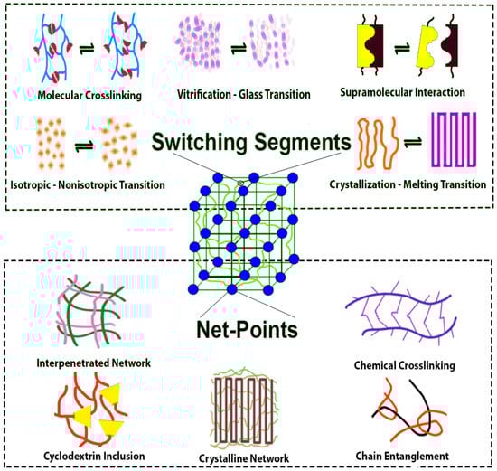 SMPs are comprised of a permanent and a temporary shape resulted from a combination of the molecular chemistry and a programming procedure [36]. The required chemical architecture involves net-points and molecular switches with a sensitivity to a stimulus. In the same sense, SMPs can also be considered as copolymers with hard and soft segments acting as fixed and reversible phases, respectively. The fixed phase prevents the flowing of the polymer chains upon applying stress while the reversible phase experiences deformation and behaves as a molecular switch. This phase freezes the temporary shape during stimulation while it returns to the original shape when the stimulation is switched [8]. The molecular mechanisms of SMPs architecture illustrated in Figure 2 can be applied to any kinds of SMPs. In this scheme, SMPs are made up of both net-points and molecular switches. This fixed phase (i.e., net-points) can be achieved by the introduction of crystalline phases, chemical crosslinks, chain entanglements, interpenetrating networks, or interlocked supramolecular complexes. Switch parts are responsible for shape fixity and recovery upon applying an external stimulus. The crystalline, liquid crystalline, and amorphous phases, supramolecular entities, light-reversible couplings, and percolating cellulose-whisker networks have been introduced as the switch units in SMPs [36]. The reversible phase fixes the temporary shape through glass transition, crystallization, isotropic transition, supramolecular interactions, and reversible covalent or noncovalent bonds.