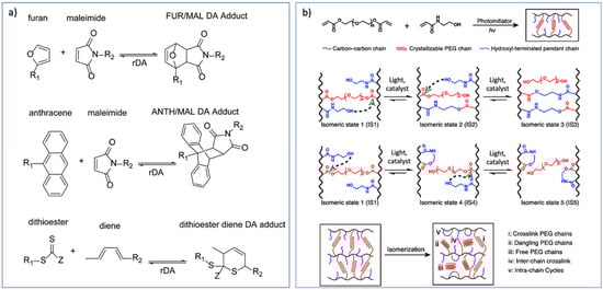 (a) Thermoreversible Diels–Alder adducts including Furan-maleimide, Anthracene-maleimide, and Dithioester diene (with permission from Wiley, Copyright 2016 [56]); (b) isomerization reaction via interchain and intrachain transesterification pathway (Reprinted with permission from ref. [74]. Copyright 2020 Nature).