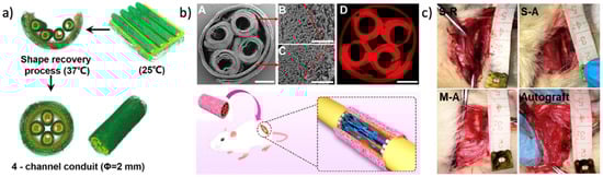 (a) Self-forming of the nerve conduit based on a shape memory nanofibrous scaffold; (b) the cross-section im-ages of the SMP multichannel nerve conduit (A–C are SEM images showing the aligned and random fiber layers, and D is fluorescence micrograph of the conduit); (c) photographs of nerve conduit transplantations at 12 weeks of postsurgery (Reprinted with permission from ref. [154]. Copyright 2020 American Chemical Society).