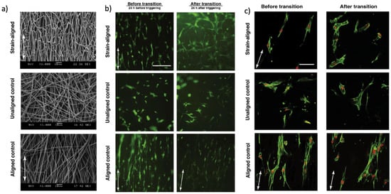 (a) The SEM images show the fiber alignment in the direction of applied strain following programming; (b) high cell viability before and after changes in the scaffold architecture; and (c) cell morphology and nuclear alignment changes after scaffold fiber alignment change (Reprinted with permission from ref. [33]. Copyright 2013 Elsevier).