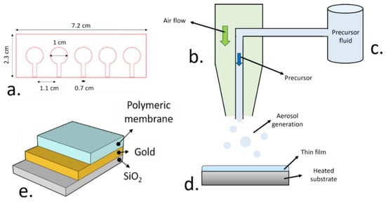 (a). Schematic representation of the methacrylate mask employed for the deposition of the sensitive polymer films. (b). Representation of the aerosol-assisted chemical deposition (AACD) process, including a pneumatic atomizer nozzle, where the aerosol is generated by using an air flow. (c). Such precursor solution is stored in a reservoir at atmospheric pressure. (d). The thin gold electrode films generated by plasma sputtering using the methacrylate mask are used as substrate for the deposition of the polymeric sensing films. (e). The final device consisted of the silica glass substrate where the thin gold electrodes were deposited along with the plasticized polymeric sensing film.