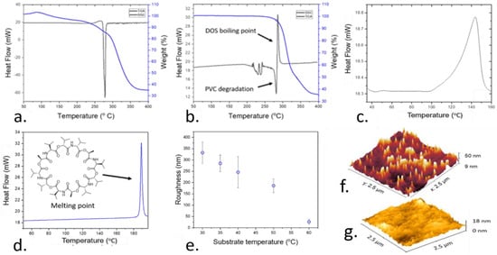 Within the present work, AACD was adapted for the deposition of highly homogeneous films with controllable thicknesses. This deposition method was first optimized in terms of temperature and deposition time to achieve a fine control over the processing conditions and morphology of the films. The temperature of the deposition played a pivotal role in this process since it influenced the thickness, roughness, and stability of the films. While PVC is a thermoplastic, with high thermal resilience [41], the stability of the rest of the components of the films including the ionophore and the plasticizer at relatively high temperatures has not been established yet. To determine the optimal range for the temperature deposition, thermogravimetric analysis (TGA) and differential scanning calorimetry (DSC) was conducted on pure PVC (Figure 2a) and plasticized PVC films, after the incorporation of DOS plasticizer within a ratio of 1:3 (Figure 2b). These techniques allowed the determination of the minimum temperature at which the composition of the sensing films was compromised due to the boiling or thermal degradation of its components (PVC, or DOS).