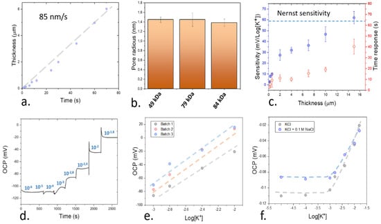 (a). Calibration of the film thickness using different deposition times by AACD. An increasing thickness was observed at higher deposition times as expected, allowing a fine control over the film dimensions. (b). Estimated pore size distribution of the low, medium and high molecular weight PVC films measured by Brunauer–Emmett–Teller (BET). (c) Changes in the sensitivity and response time of the sensing devices due to changes on the film thickness. The error bars represent the standard errors from the linear plot of the calibration. (d). Results obtained within a typical electrochemical characterization of an ion-selective electrode where the open circuit potential (OCP) of the working electrodes is monitored upon the use of different concentrations of electrolytes. (e) Testing of batch reproducibility by measuring the sensitivity of 3 different 15 µm thick sensors. (f) Determination of the selectivity against Na+ ions of the developed 15 µm thick sensing devices by the fixed interference method.