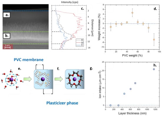 The leaching of DOS plasticizer in the water samples was consistent with the reduced sensitivity observed in these devices at thicknesses below 15 µm. However, the study of the device sensitivities alone does not provide enough information about the diffusion of ions inside these films. In some cases, a low sensitivity can also be a consequence of a co-diffusion inside the films of the target cation and the counter ion [11,53,54]. Thus, a monitoring of the mass changes inside the films at sub-micron scales was conducted using quartz microbalance to determine how the thickness of the films influenced the absorption properties of the sensing films (Figure 4h).