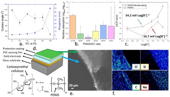 Within the present work, a mixed matrix containing PDMS elastomer and EC was developed as an upper protective film to enhance the performance of ion sensors. The combination of both PDMS and EC could prevent the chemical release and reduce the protein fouling effects when the sensors were exposed to a simulated biological environment. Firstly, the ion sensing films were deposited by using AACD under optimized conditions. An upper layer of both PDMS and EC using the same processing conditions was then applied. The hydrophobicity and the roughness of such films were characterized to establish the suitability of AACD as the fabrication method for such protective coating (Figure 5a,b). The surface hydrophobicity of films plays a pivotal role in the adsorption of biological components onto the devices, since the aggregation of proteins onto surfaces is highly driven by hydrophobic interactions [61]. In addition, the water permeability of elastomers tends to be low, which could limit the diffusion of ions and reduce the sensitivity of the sensing films. Consequently, the protective coating also incorporated a cellulose derivative to tailor the hydrophobicity and permeability of the ion sensors. Thus, smooth and hydrophilic surfaces are desired to improve the sensing performance of the films containing the protective coating. After the deposition of the protective coating, as the proportion of PDMS compared to EC increased, the film became more hydrophobic up to a contact angle of 109 ± 1° when pure PDMS was employed. By contrast, the roughness of the films increased upon the use of higher concentrations of EC. An optimal composition to avoid the adsorption of albumin was then found when the films consisted of 40 wt.% PDMS and 60 wt.% EC.