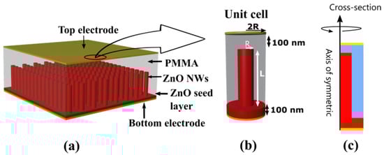 The simulation of a VING integrating billions of NWs, arranged in a pseudo-periodic disordered array, would require an extremely high computational cost. We simplified the approach by adopting a standard strategy, already used to simulate ZnO composites under compression and bending conditions [,], which consists in restricting simulation space to a unit cell made up of a single ZnO NW surrounded by an insulating matrix (PMMA in this case) over a ZnO seed layer. The unit cell is sufficient to determine the generated piezoelectric potential of a whole device sollicited under compression with a high precision if the appropriate boundary conditions are applied in the model [,]. Furthermore, a 2D axisymmetric cylindrical model was used for the unit cell as shown in Figure 1b. The 3D cylindrical geometry which derives from the 2D axisymmetric one by rotation around the NW axis, as shown in Figure 1c, was considered as a fair enough approximation. All equations and parameters were transformed from Cartesian to cylindrical coordinates (vertical and radial coordinates, z and r, respectively).