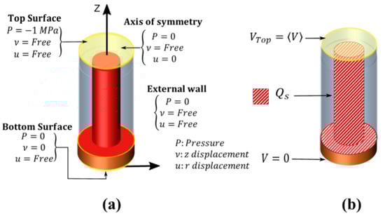 The mechanical boundary conditions consisted in (i) free vertical displacement and forbidden lateral displacement on the axis of symmetry, (ii) a vertical pressure of -1MPa along the NW axis (z-axis) with free vertical and lateral displacement on top surface, (iii) free lateral displacement with forbidden vertical displacement at the bottom, (iv) free lateral and vertical displacement on the outer lateral side (Figure 2a).