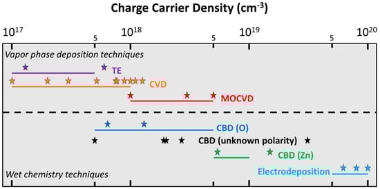 Schematic diagram summarizing experimental data for charge carrier density in ZnO NWs grown by TE [,], CVD [,,,,,,,], MOCVD [,,], CBD (O) [], CBD (unknown polarity) [,,], CBD (Zn) [], and electrodeposition [,,]. A logarithmic scale is used for doping level. The coloured solid stars represent the experimental data point reported in the literature for each growth method, as an average value [,,,,,,,,,,] or an interval of minimum and maximum values [,,,,,,,,]. The coloured solid lines represent the deduced range of charge carrier density used in the numerical simulation for each growth method.