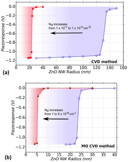 Variation of the piezoresponse of a VING as a function of ZnO NW radius taking into account two vapor deposition techniques for the growth: CVD and MOCVD. (a) A range of doping levels (Nd) from 1 × 1017 (