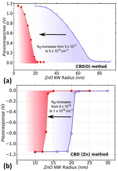 Variation of the piezoresponse of a VING as a function of ZnO NW radius taking into account the CBD deposition technique. (a) A range of doping level (Nd) from 5 × 1017 (