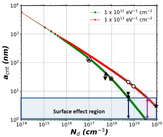 Critical radius acrit as function of Nd for two ZnO NWs with values of Nit from 1012 (green curve) and 1013 eV−1 cm−2 (red curve). The black marks on the curves indicate the radius values for which full depletion was obtained as calculated using FlexPDE. The mark (