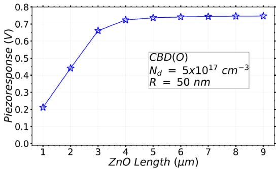 In the simulation results from the previous sections, the piezoresponse is constant if the NW radius is smaller than a certain critical radius. This piezoresponse value is then independent upon the radius and the growth method. The value depends only on the NW length and on the ratio between the diameter of the NW and the width of the VING unit cell []. Here we studied the effect of the variation of the length in the particular case corresponding to the growth conditions of the CBD method forming O-polar NWs (CBD (O)). This method presents one of the largest optimization windows and is compatible with the processing of flexible devices without any additional transfer process. For this study, the NW radius was fixed at 50 nm with Nd = 5 × 1017 cm−3. Figure 8 shows a linear increase in the piezoresponse as the NW length increases up to 3 μm. For larger values, the piezoresponse saturates to about 0.75 V in absolute value. This means that longer NWs are not required to obtain optimal devices. This theoretical result is in accordance with the trends of experiments in energy generation [], and output potential [], although the output potential values are not the same, which can be due to different electrical and structural parameters. Furthermore, the inferred optimal length of O-polar NWs around 4 µm does not represent any technical challenge: it is typically achieved by the CBD method when the synthesis conditions using zinc nitrate, hexamethylenetetramine (HMTA), and chemical additives including polyethylenimine are optimized [].