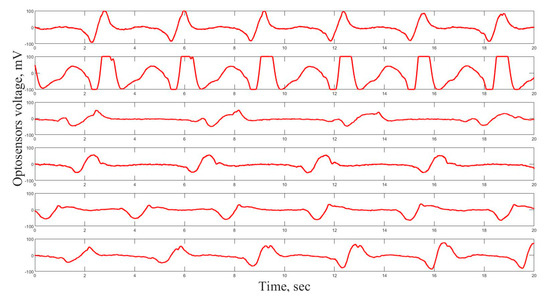 Before the experiment, the shape of the cardiogram was registered and averaged for each individual mollusk during one day in order to derive the individual control cardiogram. The operator forms a typical image form of the signal. The computer program scans the record, finds forms, which have correlation on the 75% level comparable with the typical image form and calculates the time intervals between the beats. Samples of 6 cardio signals are presented in