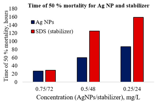 At high concentrations, the toxic effect of the stabilizer is similar to the toxicity of Ag NPs dispersion. For lower concentrations, silver dispersions appeared more toxic than the stabilizing agent. In dilution solution higher toxicity can be related with silver ions release from surface of Ag NPs. Silver ions demonstrated higher toxicity towards