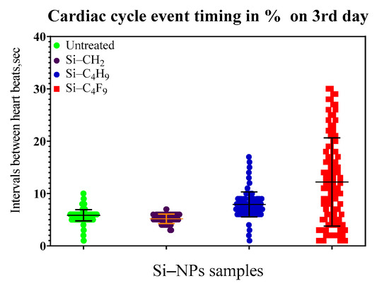 Figure 6 shows histograms of times between the beats and cardiac cycle statistics on third day of the experiment for Si NPs (48-h incubation). The distribution for the different forms of Si NPs is shown with different color. The 50% mortality for the most toxic Si NPs was observed on the third day of experiments. The comparison of the ecotoxicity of different modifications of silicon NPs (