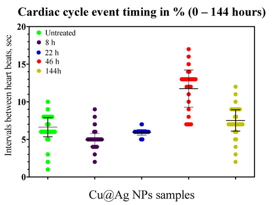U. tumidus were more sensitive to the presence of bimetallic NPs than copper NPs. In the tested group with Cu@Ag NPs, the heart rhythm increases in eight hours after the start of the experiment (inter-pulse intervals, 4–5 s). After 22 h the average interval time returned to 6–8 s. In 46 h, we observed a sharp slowdown of rhythms (intervals, 12–14 s), the rhythms remained at the slow levels for the next 80 h. Towards the end of the experiment (168 h), the rhythmic activity restored its starting parameters (