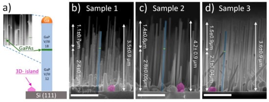 Typical cross-section SEM-images of the synthesized samples are presented in Figure 1b–d. One can note that vertical VLS NWs growth occurs simultaneously with the unwanted three-dimensional islands formed via vapor-solid (VS) mechanism [,]. Parasitic 3D islands are depicted with magenta polygons in Figure 1 and possess irregular shapes which can be associated with a large number of structural defects, as will be shown further in the XRD section. One can expect that NW array morphology, namely NW length and diameter (see Figure S1 in Supplementary Materials) should depend on the growth temperature. NWs of all the grown samples possess a hexagonal cross-section and are slightly tapered with a gradual diameter reduction towards the NW tip. Notably, NWs exhibit the same mean diameter value (120 ± 25.4 nm) at their tips independently on the growth temperature while the tapering angle reduces with the growth temperature decrease, i.e., the low-temperature sample exhibits a more enlarged NW base, which can be related to the radial vs. growth.