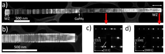 Dark-field TEM (DF-TEM) imaging with a diffraction contrast was carried out to investigate the crystal structure of individual NWs. NWs were oriented with [110] ZB zone axis along the e-beam, which allows stacking faults and lattice twining to be distinguished. A typical DF-TEM image of a single NW of Sample 2 with a diffraction contrast corresponding to GaP WZ-phase is presented in Figure 2a,b (bright contrast corresponds to the WZ phase). It can be seen that stabilization of the WZ-phase occurs at the top and the base of NW, which is assumed to be associated with the droplet consumption and droplet size stabilization stages, correspondingly. The contrast between GaPAs and ZB-GaP segments is also visible in DF-TEM images (the GaPAs segment is marked in Figure 2a with the white arrow) as thin GaPAs nanodisks embedded in GaP NWs tend to stabilize in the WZ-phase due to the strain effects, as reported in our previous works [,]. The close-up DF-TEM images presented in Figure 2b reveal high-density lamellar twinning in the top NW segments with an average twin thickness of 7–8 nm. Note, the defect density is higher at the topmost NW part. Electron microdiffraction patterns acquired at the regions of NW with ZB and WZ structures are shown in Figure 2c,d, respectively. One can see a typical <110> zone axis electron diffraction pattern from a twinned ZB structure with a 180° rotational twining around [111] NW growth direction [,]. Diffuse streaks oriented along the NW growth direction axis in the ZB diffraction pattern point out the high density of twin planar defects []. On the contrary, the WZ diffraction pattern demonstrates sharp spots, which indicates a low density of stacking faults.