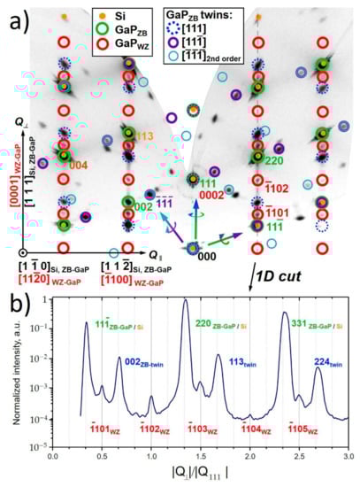 One can also note the appearance of the additional set of the off-specular diffraction spots located in the middle of split pairs of the rotationally twinned ZB-GaP and Si Bragg peaks. The observed diffraction spots correspond to the WZ GaP [110] zone axis pattern. The corresponding model of the WZ zone axis pattern is depicted by the red circles in Figure 4a. The cross-section of the RSM through the off-specular 11 and 220 Si Bragg peaks along the [111] direction demonstrating relative position of the ZB and WZ GaP reflexes is shown in Figure 4b The acquired profile shows the presence of both Si and twinned ZB-GaP peaks with WZ phase Bragg peaks in between, at integer and half-integer value positions of normalized perpendicular component of diffraction vector |Q⟂|/|Q111GaP| []. This observation also coincides with TEM results.