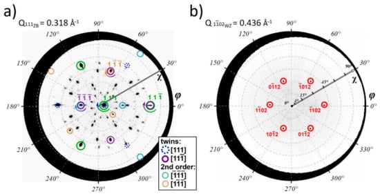 It should be taken into account that both NWs and parasitically grown islands make a contribution to the acquired diffraction pattern. Formation of the rotational twins in the ZB lattice is a common effect if the growth facet is one of the {111} planes [], and thus three-dimensional islands with {111} facets can also possess rotational twinning. To untangle all possible GaP lattice orientations, a spherical cross-section of a fixed-length X-ray scattering vector was cut from the obtained RSM data and its stereographic projection (pole-figure) was plotted. The obtained pole figures for the scattering vector values corresponding to the diffraction from ZB {111} and WZ {102} crystal planes are presented in Figure 5 and show all possible orientations of the chosen crystallographic planes.