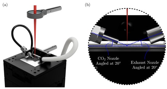 (a) Rendering of the fs-laser micromachining setup. Stainless-steel coupons are mounted horizontally on XY translation stages, 3 mm closer to the laser focusing lens than the focal point. A stationary nozzle is used to introduce CO2 gas at the point of laser irradiation. (b) Magnified rendering of the CO2 nozzle and exhaust line in relation to the stainless-steel substrate and laser beam spot.