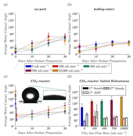 What is especially interesting to note in Figure 5a is that even after 30 days of aging in the lab air with no water contact, the LIPSS themselves which decorate the no-post sample prepared with a high flow rate of CO2 gas during micromachining remain hydrophilic. In fact, the second sessile water droplet to touch this undisturbed surface—the first to touch the LIPSS themselves—presents with an average contact angle of , statistically equivalent to the average sessile contact angle measured at day 0 on the same surface preparation (see Figure 2a). Figure 3 shows LIPSS visible underneath the nanoparticle agglomerates which homogeneously cover the surface when CO2 gas is streamed during micromachining. However, we hypothesize that the chemical reaction at the surface is blocked from occuring by a coverage of small non-sintered nanoparticle clusters. Crystallographic techniques could be used in future studies to distinguish the laser-induced nanoripples, integral to the surface, from non-sintered nanoparticles sitting atop them. Figure 5a shows that even the elevated pressure, temperature, and carbon dioxide-rich environment used to prepare the 10,000 mL·min−1CO2-reactor sample was not sufficient to completely overcome the blocking of the reactive surface by nanoparticles and nanoparticle agglomerates. Even though this CO2-reactor sample is more hydrophobic than the no-post sample prepared with the same 10,000 mL·min−1 CO2 stream during the micromachining step, both the high flow rate surfaces are much less hydrophobic than the two undisturbed samples prepared with no gas stream during irradiation.