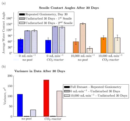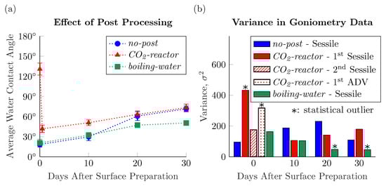 (a) Average sessile contact angle measured on no-post and CO2-reactor surfaces left undisturbed for 30 days after fabrication before goniometric measurements were taken. (b) Variance in the sessile water contact angle data presented in part (a).