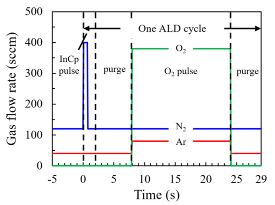 In2O3 films were prepared by a PEALD system (R-200, Picosun, Espoo, Finland) using cyclopentadienyl indium (InCp, Aimou Yuan, Nanjing, China) as the indium precursor. The indium precursor bubbler was maintained at a temperature of 90 °C which is higher than the sublimation temperature of InCp (40 °C) to provide sufficient vapor pressure [13,14]. Nitrogen (N2) gas was used as both the carry gas (120 sccm) and dilute gas (400 sccm) of the indium precursors. The flow rates of the gases with respect to the time sequence were plotted in Figure 1. Before starting the ALD process, N2 gas in a total flow rate of 120 sccm was injected into the reaction chamber from six spray heads distributed in the upper corner of the chamber and Argon (Ar) gas in a flow rate of 40 sccm was injected from a spray head on the right top of the chamber. Meanwhile, the gas was pumped out of the chamber from the bottom by a pump system. In this way, the chamber was kept clean by filing of inert gas. A base pressure of about 100 Pa was achieved after the balance of the gas injection and pumping out before starting the ALD process and kept throughout the whole process with negligible influence from the precursor pulses. An ALD cycle can be described as follows: firstly, the indium precursor was diluted by N2 gas of 400 sccm for 0.7 s, then the diluted indium precursor was carried into the chamber by N2 gas (120 sccm) for 1.3 s and adsorbed on the substrate; then, a purge step was executed with a pulse time of 6 s using N2 (120 sccm) and Ar (40 sccm) gas; next, a mixture gas of Ar and O2 with a respective flow rate of 80 and 380 sccm was injected into the chamber and discharged by an inductive coupled RF power of 3000 W to generate O2 plasma working in a remote mode with a distance of about 60 cm between the coil and the substrate surface; finally, a purge step was executed with a pulse time of 5 s. The pulse durations mentioned above have been tuned aiming at reaching a saturated film growth rate or removing the redundant precursor and reaction byproduct. The films were grown by repeating the ALD cycle as described above. Four hundred cycles were executed in total for each specimen. The substrate temperature was varied from 100–350 °C to investigate its influences on the mechanism of the film growth and the film properties. The parameters for the PEALD process were summarized in Table 1.