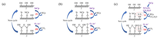 where S- represents the substrate surface. The symbol ↑ denotes the volatile gaseous phase. The chemical formula for InCp is In(CH)5. In the first half-reaction, the InCp with a ratio of x chemically reacts with surface hydroxyl (OH) groups to form O–In bonds and release x volatile cyclopentadiene (CpH) and (1 − x)/2 H2, leaving (1 − x) InCp that is physically adsorbed on the surface by van der Waals interaction force and does not participate in forming O–In bonds as described in formula (3). In the second half-reaction, oxygen radicals supplied by the O2 plasma react with the resulting surface to form In–O bonds, to regenerate initial hydroxyl ligands and release CO2 gas as described in formula (4). The film growth in different substrate temperature ranges is dominated by different mechanisms as depicted in Figure 2, which also lead to different behaviors in the film growth rate. Detailed description on the mechanisms would be discussed along with the growth rate mentioned below.