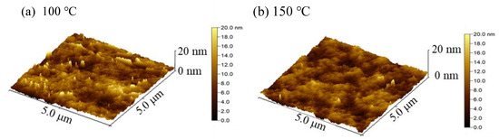 Figure 6a–f shows the three-dimension AFM images of the In2O3 films deposited at various substrate temperatures. The root-mean-square roughness (Rq) was also extracted from the images and plotted in Figure 6g. The In2O3 films deposited at low temperature (100 °C and 150 °C) exhibit smooth surface with an Rq value of around 0.5 nm owing to the uniform amorphous phase. The film surfaces become rougher with an Rq value of around 1–1.2 nm when deposited at intermediate temperature (200 °C and 250 °C) due to the crystallization. The roughness of the film surface increases significantly when deposited at a high temperature (300 °C and 350 °C) due to the existence of the coarse clusters. Overall, the development of structural and morphological characteristics agrees well with the mechanisms of the film growth at different substrate temperature ranges.