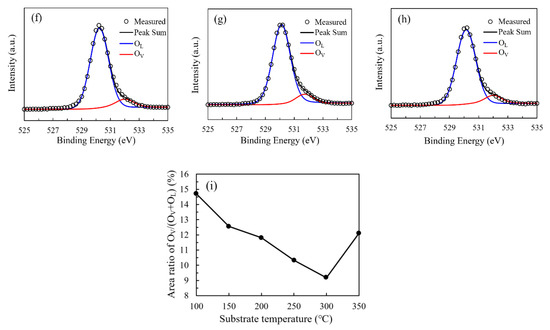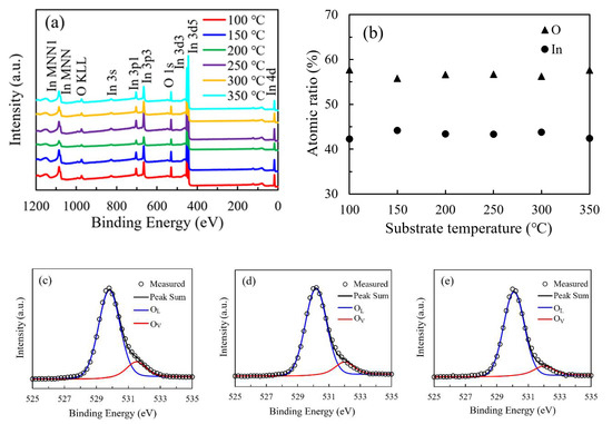 Figure 7a shows the broadly surveyed XPS spectra of the In2O3 films. The observed peaks correspond to the In or O element. The variation of the relative atomic ratio of In and O elements with substrate temperature was shown in Figure 7b. All the In2O3 films were In-rich/O-poor with the In-atom-ratio higher than 40% an O-atom-ratio lower than 60% when compared with the stoichiometric In2O3. The O atomic ratio is almost constant with values of 55.8%–56.7% in the temperature range of 150–300 °C. Otherwise, the O atomic ratio is slightly higher with values of 57.7% and 57.6% for the In2O3 films deposited at 100 °C and 350 °C, possibly due to the great deviation from the saturated ALD growth mode at these two extreme substrate temperatures. The In atomic ratio exhibit opposite variation tendency. The higher O content for the films deposited at 100 °C and 350 °C should be ascribed to the relative shortage of the chemically absorbed precursors due to the low energy at low substrate temperature and the thermal decomposition of the precursor at high substrate temperature. In contrast, the supply of O2 plasma oxidant is relatively adequate, resulting in the higher O content for these films. The O 1s peak was deconvoluted into two components located at around 529.8 eV (OL) and 531.4 eV (OV), respectively, related to the O atoms in a stoichiometric and oxygen-deficient In2O3 lattice as shown in Figure 7c–h [11,14]. The area ratio of OV/(OV+OL) was used to reflect the amount of oxygen vacancies and shown in Figure 7i. The area ratio continuously decreases from 14.7% to 9.1% as the substrate temperature increases from 100 °C to 300 °C, suggesting that the ratio of chemically adsorbed precursors increases, and hence more oxygen atoms participate in forming In–O bonds as the reaction energy provided by heating the substrate increases, resulting in a more perfect In2O3 lattice. However, the total O-content in the film exhibits a weak dependence on the substrate temperature. There is a seeming paradox between the variation trends of the oxygen vacancy concentration and the total O-content. In fact, they are unnecessarily related to each other since the oxygen atoms may exist as lattice oxygen, oxygen interstitials (Oi) or OH ligands with binding energies located at 529.8, 532.4 and 531.9 eV, respectively [24,25]. Although the (Oi) or OH components cannot be distinguished from the O1s peak, there are still possibilities that more oxygen atoms may exist as oxygen interstitials or OH ligands in the film when deposited at a relatively low substrate temperature due to the low ratio of chemically adsorbed precursors. As a result, a poorer In2O3 lattice was formed. As the substrate temperature increases, the oxygen interstitials and OH ligands reduce, meanwhile more oxygen atoms incorporate in forming the In2O3 lattice. Therefore, it is reasonable for the total O-content to keep at an almost constant level. As the substrate temperature further increases to 350 °C, the area ratio increases to 12.1%, possibly due to the severe decomposition of the precursors at such a high temperature.