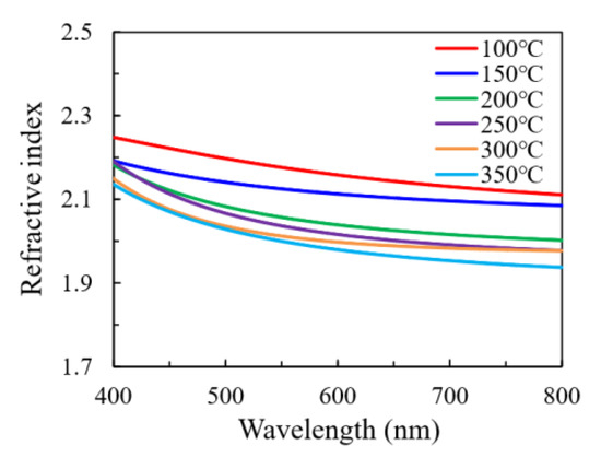 Figure 9 shows the wavelength-dependent refractive index (n) of In2O3 films. Generally, the refractive index of the thin film can be affected by the crystallinity, constituent and density of the film [26,27,28]. In this case, the crystalline fraction seems to have primary influence on the refractive index. In addition, the variation in the constituent, the chemical states of constituent elements and the density of the film may play a role in influencing the refractive index for the films with the same crystal phase. Broadly speaking, the In2O3 films deposited at low temperature (100–150 °C) are amorphous and exhibit a relatively high refractive index. The observation from the SEM results also suggests a compact structure of these films, which rationalizes their high refractive indices. The minor deviation between the refractive indices of the films deposited at 100 °C and 150 °C is possibly related to the variation in the film constituent and the chemical states of the O elements. As observed by the XPS, the film deposited at 100 °C has higher O-content and more O atoms may exist as oxygen interstitials or OH ligands. In addition, the possible-existing carbon content that has been reported to decrease with increasing substrate temperature may have influence on the refractive index [14,18]. A sharp decrease in refractive index at 150–200 °C was observed, which should be ascribed to the amorphous-to-crystalline transition. The refractive indices for the films deposited at 200 °C and 250 °C are very close to each other as the substrate temperature located in the ALD window with self-limiting reaction. However, the refractive index further decreases as the substrate temperature increases to 300 °C and 350 °C, which should be ascribed to the decomposition of the indium precursors. As has been observed by the FESEM results, large clusters with significant grain boundaries have been observed, which leads to a coarse film with a loose structure.