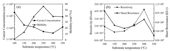 Figure 11a shows the variation of carrier concentration and mobility of In2O3 film with substrate temperature. The variation of carrier concentration exhibits similar trends to that of the amount of oxygen vacancies. This is accordant to the common viewpoint that oxygen vacancies act as one of the major origins for the n-type conductivity in In2O3 film [29,30,31]. The In2O3 film deposited at 100 °C has a very low carrier mobility of 1.6 cm2/V·s due to the existence of a large amount of defects. However, the carrier mobility significantly increases with increasing substrate temperature and reaches the highest value of 56.3 cm2/V·s when deposited at 250 °C owing to the reduction in defects and the formation of more perfect In2O3 lattice. Nevertheless, it decreased to around 40 cm2/V·s when the substrate temperature further increased to 300–350 °C, possibly due to the scattering by the obvious grain boundaries as observed by the SEM. The variation of film resistivity (ρ) and sheet resistance (Rs) with substrate temperature is shown in Figure 11b. The relation between film resistivity and sheet resistance can be expressed as: ρ = Rs·t. The sheet resistance is film-thickness-dependent while the film resistivity is much less influenced by the film thickness. Thus, we focus on the film resistivity to reflect the electrical properties of the films. The resistivity of the In2O3 film is determined by the carrier concentration and mobility. Overall, the film resistivity increases with increasing substrate temperature and reaches the highest value of 4.25 × 10−3 Ω·cm at 300 °C due to the decrease in carrier concentration. The relatively high resistivity of the film deposited at 100 °C is due to the low carrier mobility. Then, it reduces to 1.33 × 10−3 Ω·cm at 350 °C due to the increase in carrier concentration.