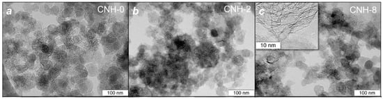 Figure 1 shows typical TEM images of the samples CNH-0, CNH-2, and CNH-8. The synthesized CNHs can be assigned to the “seed-like” type [37]. Spherical aggregates in the sample CNH-0 consist of individual nanohorns with a length of ~5 nm and a diameter of ~2 nm (for details, see [2,5]). The SEM image of the sample CNH-0 shows 30–50 nm large nanohorn aggregates (Figure 2a). The addition of toluene into the synthesis increased the nanohorn length up to ~10 nm. The samples CNH-2 and CNH-8 mostly contain ~100 nm associates formed by CNH aggregates, whereas individual aggregates are rare (Figure 2b,c).