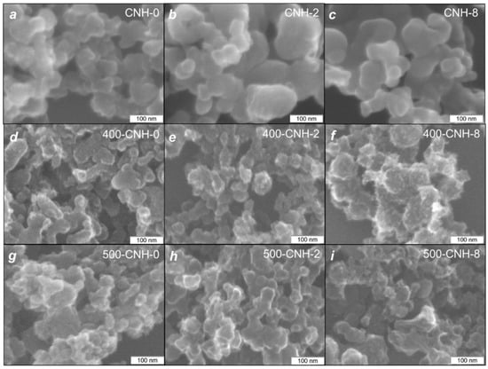 Further, CNHs were heat treated at 400 and 500 °C in air. The temperature of 400 °C corresponds to the combustion temperature of amorphous carbon [38,39]. Weighing of samples before and after 1 h treatment showed a small weight loss for the samples 400-CNH-x (x = 0, 2, 8; see Table 1) that indicates a high chemical purity of our CNHs from the amorphous carbon. Since single-walled carbon nanotubes have been opened by 500 °C treatment [40], we chose this temperature for the treatment of CNHs. The oxidation at 500 °C decreased the weight of the samples CNH-0, CNH-2, CNH-8 by 19%, 18%, and 8%, respectively (Table 1). According to the SEM study, the treatment of CNHs in air at 400 and 500 °C decreases the size of associates and aggregates (Figure 2d–i). The shape of aggregates differs from sphere-like, indicating partial removal of carbon from the samples.