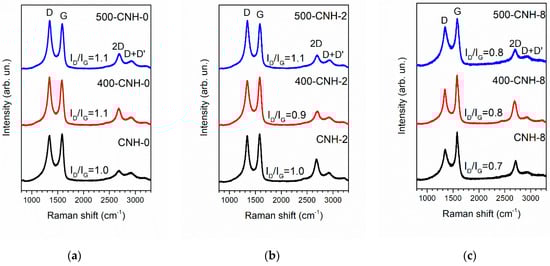 The Raman spectra of our samples are characteristic for sp2-hybridized carbon materials with defects (Figure 3). The peak at 1580 cm−1 is formed by the G mode corresponding to the graphite lattice vibrations. The broad peak at 1350 cm−1 corresponds to the D mode, which appears in the presence of defects in the graphite network [41]. The peak 2D at 2700 cm−1 is characterized by an overtone of the D band. The weak peak at 2920 cm−1 is formed by the overtone of D mode and D’ modes [42,43]. After the treatment of the sample CNH-0 at 400 and 500 °C in air, the ratio between integral intensities of D- and G-bands (ID/IG) are almost constant. For 400-CNH-0, the attachment of additional oxygen-containing groups causes an increase of the ratio between the integral intensity of D+D’- and G-bands (ID+D’/IG); an increase of 2D band could be due to the enhanced average crystallinity after the removal of an amorphous constituent. The oxidation process was expected to further increase the content of oxygen-containing groups attached to the nanohorns with temperature and to the opening of their endcaps [44]. As a result, the crystallinity of the sample 500-CNH-0 deteriorated, as shown by the decreased intensity of the 2D-band. The spectra of the samples CNH-2 and CNH-8 exhibit a lower value of ID/IG and higher intensity of the 2D band than that of the sample CNH-0. This suggests that the addition of toluene into the carbon arc promotes the formation of nanohorns with more regular graphitic lattice. For 400-CNH-2, the I2D/IG value decreased probably due to the attachment of oxygen groups to the surface. The opening of nanohorn’s endcaps at 500 °C produces dangling bonds, which are attacked by oxygen, increasing the ID/IG value. Among other samples, CNH-8 exhibits a lower ID/IG value.