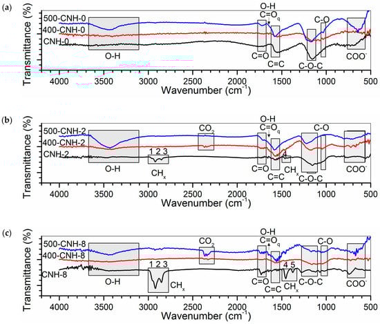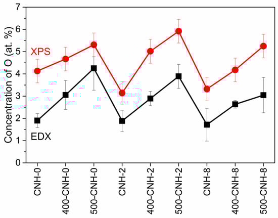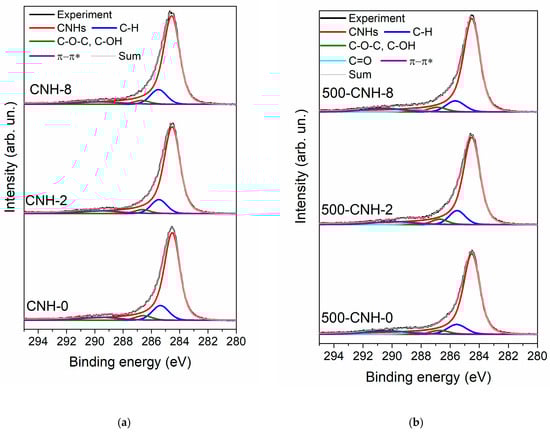 XPS provides the further probe of the nature of chemical bonds in the CNH samples and transformations of the functional groups as results of toluene addition and heat-treatment in air. The survey XPS spectra of the samples detected carbon and oxygen as dominant elements. The surface concentration of oxygen was estimated to be ca. 4 at.% for the sample CNH-0 and ca. 3 at.% for the samples CNH-2 and CNH-8. The oxygen content remained near the same after 400 °C treatment, while it increased to 5, 6, and 5 at.% for the samples 500-CNH-0, 500-CNH-2, and 500-CNH-8, respectively. The oxygen contents determined by the surface-sensitive XPS method agree well with the data obtained by EDX spectroscopy from a depth of less than 5 µm (Figure 6).