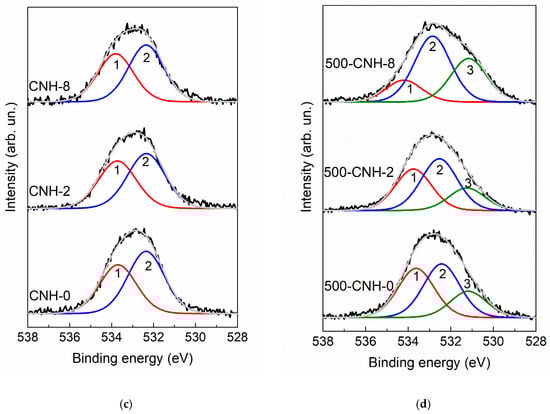 The changes in the XPS O 1s spectra of CNHs occurred after thermal oxidation are similar for all samples against the background of a low concentration of oxygen (Figure 7c,d). The spectra of initial samples have two components located at 533.7 and 532.4 eV (denoted as 1 and 2). Component 1 could be related to H2O adsorbed from the air. Component 2 could be assigned to hydroxyl (–OH) and ether (C–O–C) groups [61]. The spectra of samples 500-CNH-0, 500-CNH-2, and 500-CNH-8 contain the additional component 3 located at 531.3 eV, which can be assigned to the C=O bonds in quinone and carboxyl groups [61]. Considering the integrated intensities of peaks 2 and 3, the number of functional oxygen groups on the surface of the sample 500-CNH-8 is significantly higher than that of the other samples.
