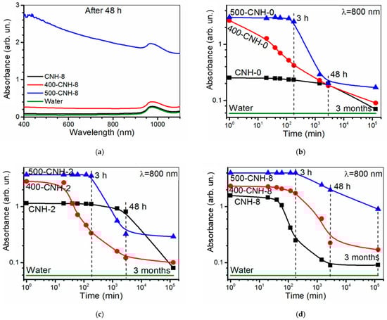 The rate of particle sedimentation and the stability of suspensions were estimated from optical absorption spectra recorded in 1, 20, 40 min, 1, 2, 3, 24, and 48 h, and 3 months after the sonication. A broad absorption peak at 930–1050 nm corresponds to water absorption, while no peaks corresponding to the interaction between water and nanohorns are observed (Figure 8a). The absorption of the aqueous suspensions of heat-treated CNHs increases. This effect can be ascribed to the reduction of particle size with oxidation that agrees with the previous results [15].