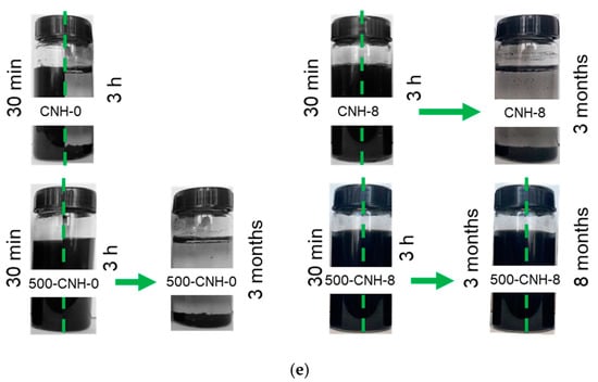 The absorbance data acquired at 800 nm are compared in Figure 8b–d. The sample CNH-0 exhibits the hydrophobic behavior over 3 h. For longer intervals, the dispersed particles partially fall down (Figure 8e). This process continuous until the sedimentation of the most particles at the end of the 3rd month. As a result, the spectral intensity is close to that of clean water. Immediately after sonication, the suspensions 400-CNH-0 and 500-CNH-0 are darker than that for CNH-0, however, the oxidized particles sediment during 24 h. It seems that the amount of functional groups on the surface of samples 400-CNH-0 and 500-CNH-0 is not enough to form stable hydrogen bonds with water molecules. The stability of the suspensions CNH-2 and CNH-8 improves compared to that of suspension CNH-0 probably due to the CHx-induced enhancement of CNH aggregates interaction with water molecules. The increase of the oxidation temperature allows improving the long-term stability of CHx-modified CNHs aqueous suspensions. Despite the sedimentation of some portion of the materials, the suspensions 500-CNH-2 and 500-CNH-8 demonstrate dark coloring even after 3 and 8 months. The hydrophilicity of heat-treated CHx-modified CNHs in water could be related to the higher concentration of oxygen-containing functional groups consistent with the oxidation mechanism discussed in the previous section. Namely, the functionalization of etched nanohorns endcaps along with the transformation of −CHx moieties into C=O groups followed by the formation of COOH groups. The obtained dispersibility of the sample 500-CNH-8 is superior to those for CNHs suspensions in water/butanol (stable over several days) [63], and water/ethylene glycol (stable over 6 months for concentrations of CNHs of 5–50 µg/mL) [64], and aqueous suspension of acid-oxidized CNHs (stable over several weeks) [15].