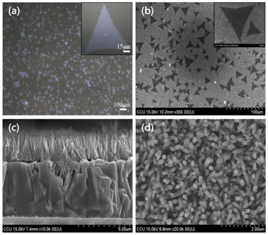 Component surface topography: (a) OM image of MoS2 grown on a sapphire substrate; (b) SEM top view of MoS2 transferred to Cu2O; (c) cross-sectional view of ZnO/Cu2O heterojunction; and (d) surface topography of ZnO nanorods.