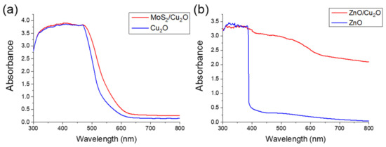 Ultraviolet–visible light spectrum analysis diagram of (a) MoS2/Cu2O and (b) ZnO/Cu2O.