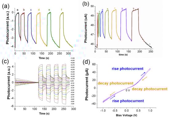 Figure 5c,d present the I-T and I-V diagrams of the bias value, rising current, and decay current value from +1.0 V to −1.0 V, respectively. In Figure 5c, when a positive bias voltage is applied to the component, the larger the bias value is, the greater the photogenerated current will be. When applying a negative bias voltage, the smaller the bias value is, the smaller the photogenerated current will be. This finding reflects the positive bias value. Figure 5d demonstrates the photocurrent value and bias voltage graph of the original element at each bias value for the 10th second of light-on and the 10th second of light-off in each period. As the bias voltage increases, the current rises and decays. The greater the current gap is, the greater the increase in the current value will be when compared to the decay current. In the negative bias voltage, as the bias voltage increases, the gap between the rising current and the decaying current becomes larger; however, the rising current value is smaller than the decay current value.
