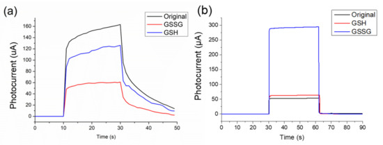 The P-type structure transfers MoS2 onto P-Cu2O, in which Cu2O is not completely oxidized, and Cu2O remains between the structures. Thus, the cross-doping phenomenon of Cu2O and MoS2 occurred in the thin film surface. The EC and EV of cuprous oxide are about −1.91 and 0.29 eV, respectively, while those of copper oxide are about −1.01 and 0.41 eV, respectively [54]. The components are illuminated by electrons. Transition occurs from the valence band to the conductive band. After the electrons and holes are transmitted due to the energy level difference, the holes react with characteristic substances on the surface. To verify the detection mechanism of the P-type photoelectrochemical biosensor, we used GSH and GSSG as characteristic substances to measure the element. The experimental method is as follows. First, use sucrose solution and two characteristic substances of GSH and GSSG to prepare a detection solution with a molar concentration of 5 mM, and then use the light response system set up in this experiment to measure and observe the original components of this structure, and drop them into GSH. Determine the difference between the light switch and the GSSG characteristic solution. Figure 6a shows that the P-type photoelectrochemical biosensor has a larger response to GSH.