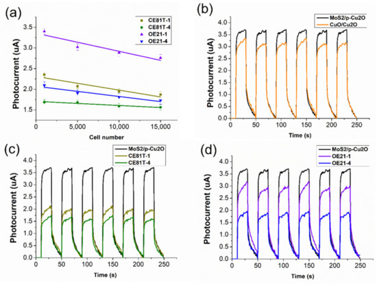 Photoelectrochemical response of esophageal squamous cell carcinoma: (a) P-type element modulates the linear relationship between the number of four cancer cell lines and light response analysis. (b) Comparison of light response analysis between MoS2/Cu2O and original elements; (c) MoS2/Cu2O and CE81T-1 and CE81T-4; and (d) MoS2/Cu2O, OE21-1, and OE21-4.