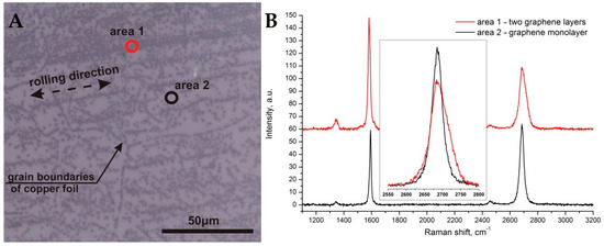 According to the described protocol at first, the graphene was synthesized on initial copper foil, transferred onto Si/SiO2 substrate and analyzed by Raman spectroscopy (see Figure 1). The picture clearly shows dark areas that correspond to the additional layer of graphene (area 1), as seen from the Raman spectra. Moreover, the optical contrast shows that the graphene film uniformly covers the entire area and the additional layer is covered according to a clear pattern. This pattern corresponds to the direction of rolling of copper foil during its manufacture. It is known that to make a thin foil (25 micrometers), a thick copper sheet is rolled several times between rolls to reduce the thickness. It is because of the unevenness of these shafts that furrows are formed on the copper foil. Other features of the appearance of additional layers of graphene are associated with irregularities of the polycrystalline foil at the junction of metal grains. Figure 1 (left part) clearly shows the lines of formation of additional graphene layers forming the boundaries of the foil crystallites. The Raman spectra of single-layer graphene and additional graphene layer are presented in Figure 1 (right part)and the comparison of 2D bands from different areas of samples is demonstrated in Figure 1 (right part) in the inset. The evolution of single-layer graphene to double-layer graphene is clearly seen [26].