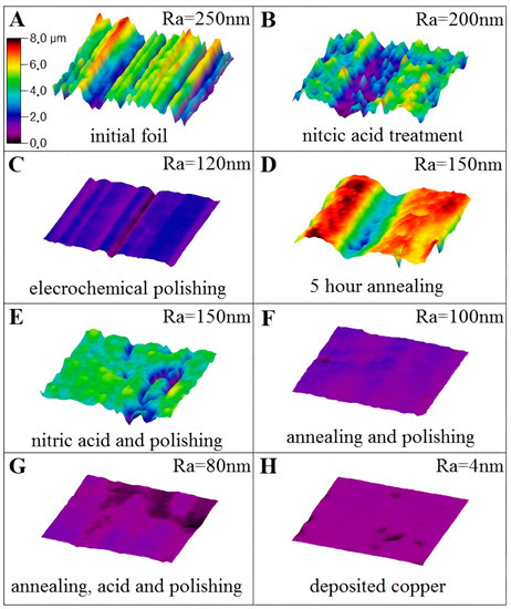 In this work, six methods were used to form the surface with minimal roughness. The result of the analysis of surface morphology after different treatments is shown in Figure 2. The initial copper foil has the arithmetic average roughness Ra about 250 nm (Figure 2A). The treatment of the sample in nitric acid leads to Ra about 200 nm (Figure 2B), while ECP can provide Ra = 120 nm of the foil (Figure 2C). The annealing process results in the same Ra = 150 nm of copper foil as the combination of nitric acid treatment with further ECP, see Figure 2D,E, respectively. The combination of annealing and further polishing, as well as annealing and further acid treatment and ECP results in the roughness of 100 and 80 nm and are presented in Figure 2F,G, respectively. For comparison, the morphology of thin copper film (Ra = 4 nm) deposited on an optically flat single-crystal sapphire substrate is shown in Figure 2H.