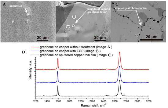 SEM images and Raman spectra (D) of graphene films synthesized on copper foils with different treatment ((A)—without pre-treatment, (B)—polishing) and (C)—deposited copper.