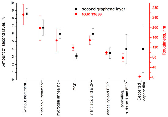 The effect of method of copper treatment on average roughness of copper surface (red circles) and the amount of graphene additional layer (black squares).