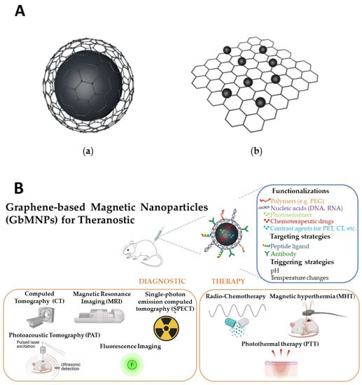 (A): Illustration of two basic configurations of GbMNPs. (a) Graphene-based materials encapsulated magnetic nanoparticles (GbEMNPs) and (b) graphene-based materials decorated with magnetic nanoparticles (GbDMNPs). (B): Schematic representation of graphene-based magnetic nanoparticles (GbMNPs), their usual functionalization, targeting and triggering strategies, as well as their most used combined diagnostic and therapeutic applications (theranostic) described in the literature. Created with BioRen-der.com.